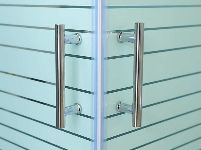 Klart hærdet glas med tryk, krom aluminiumsprofil, håndtag med to huller, med bakke